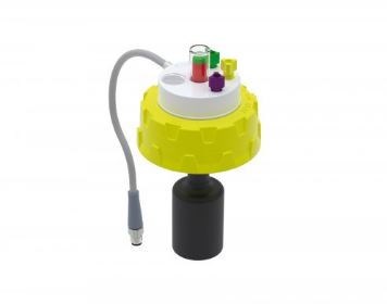 To avoid spill over of canisters through the connection of a Waste Cap to a b.safe Display for electronic level control. The filling levels of waste containers in laboratory cupboards and workbenches can be reliably monitored. Additionally, you can use all benefits of b.safe Caps such as the connection of capillaries through b.safe Fittings and tubing with the appropriate hose connectors. Solvent vapours from the escaping air during filling are restrained from the Exhaust Filter with active carbon filling.