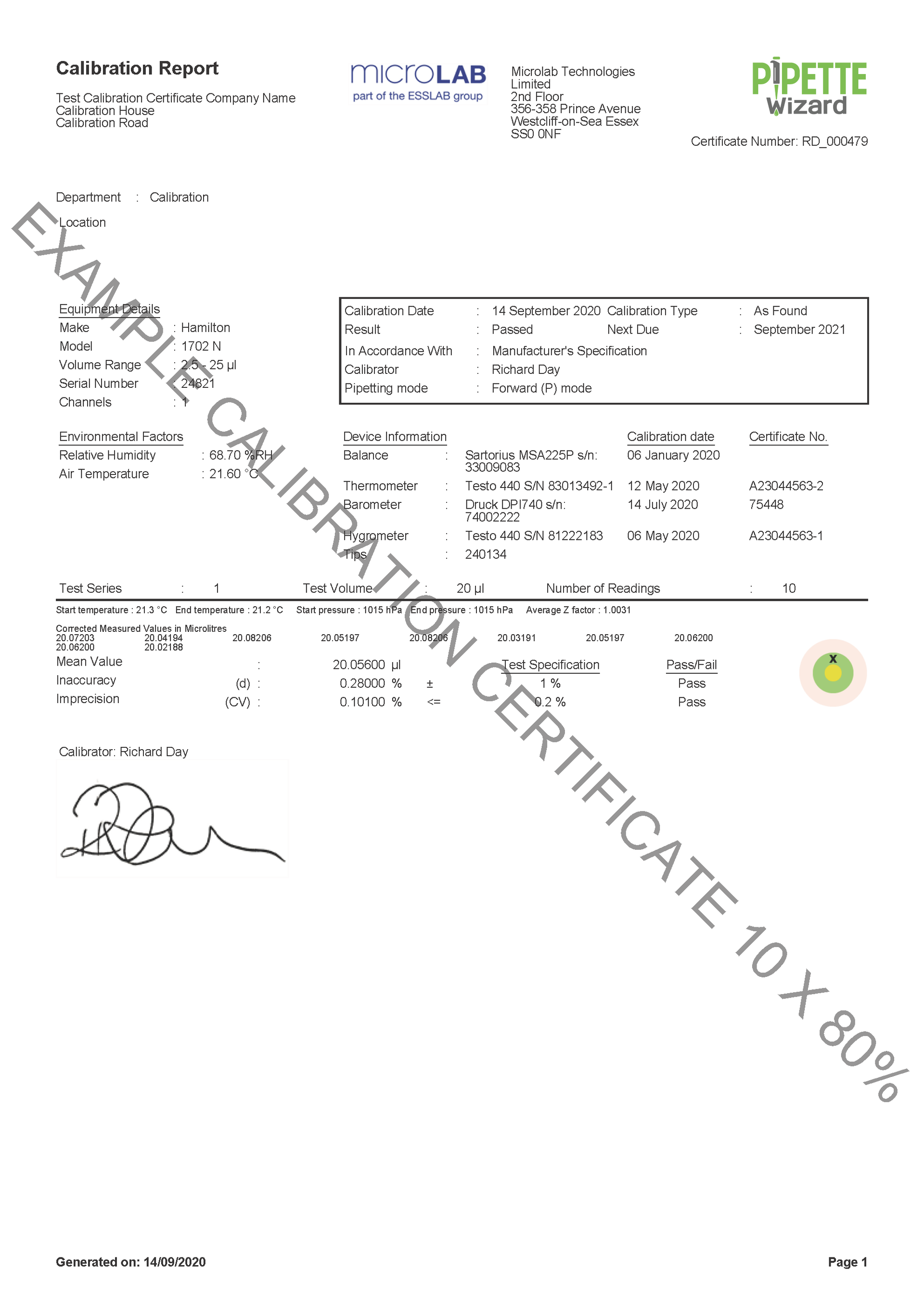 All instrumentation and weights used in these procedures have fully documented calibration to international standards.